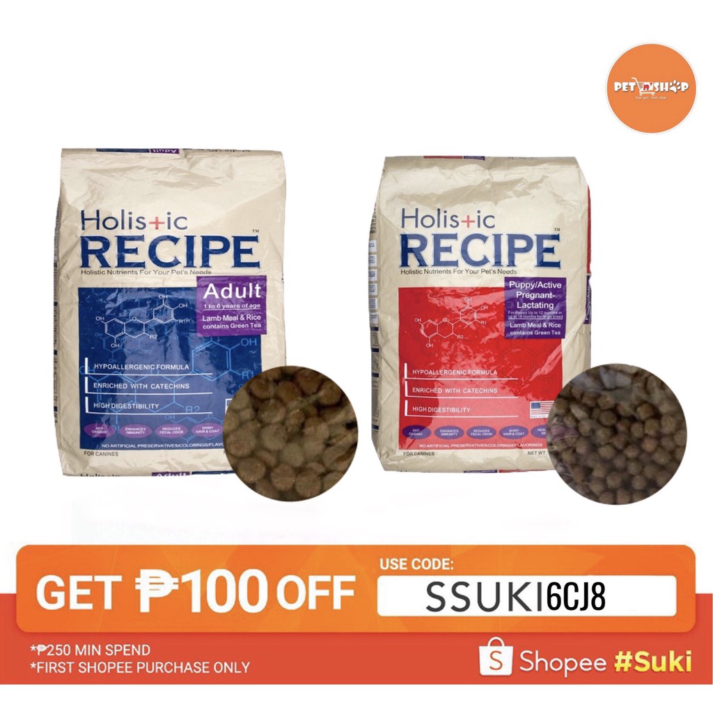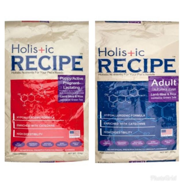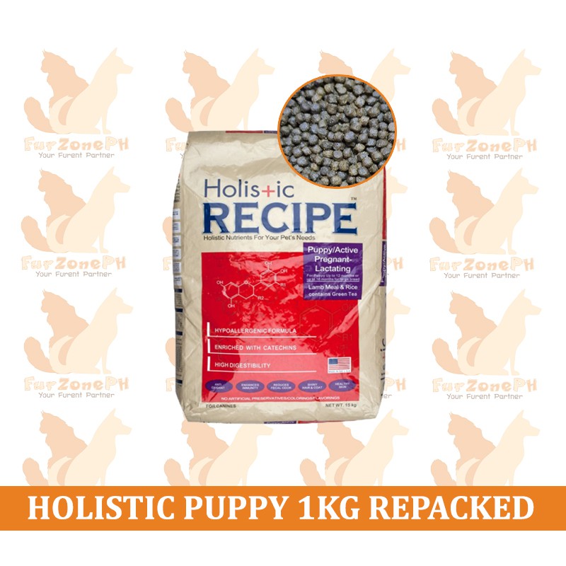 Holistic Recipe Lamb and Rice Formula includes greeb tea lamb meal and brewers rice all high quality ingredients that provide a healthy balanced diet for puppies up to 12 months of age or 18 months for large breed and for pregnant. Holistic Recipe Puppy Lamb Meal and Rice contains Green Tea Dog Food PHP 156 SELLING HOLISTIC PUPPY DOG FOOD made in the US lamb meal and rice contains green tea for puppyactive pregnant-lactating dogs P156 - 1kilogram REPACKED and SEALED P2215 - 15 kilogram sack we also sell other pet food vitamins supplements accessories and cages for very LOW PRICES. Holistic Recipe keeps these important points in mind to give your canine friend the best.